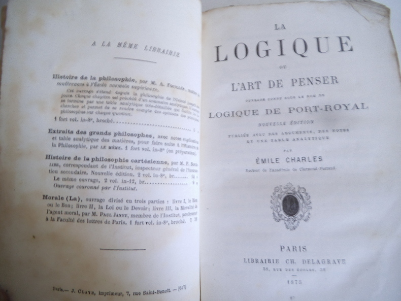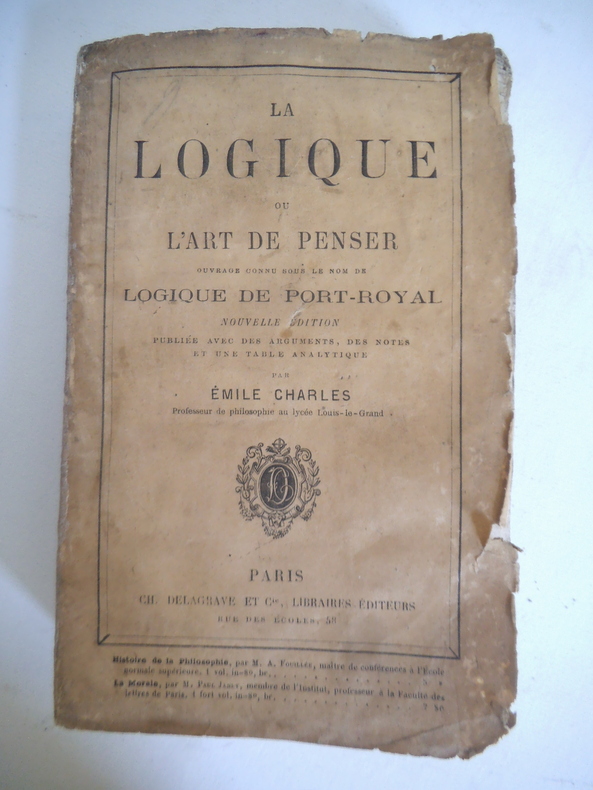 Ouvrage connu sous le nom de Logique de Port-Royal.Nouvelle édition publiée avec des arguments,des notes et une table analytique.In 12 broché,120x185mm,faux-titre,titre,VII,485 pages,Paris Charles Delagrave 1875.(Couverture poussiéreuse, dos cassant rousseurs éparses, plus concentrées en début et fin de volume.