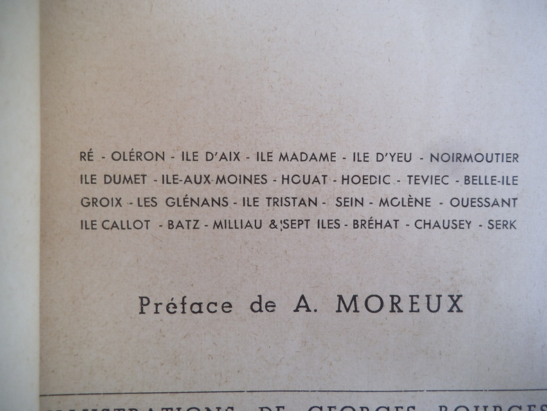 Ile-aux-Moines, Houat & Hoedic, Belle-Île, Groix, Les Glénans, Sein, Molène, Ouessant, L'Île Callot, Batz, Les Sept Îles, Bréhat, Îles Chausey, Serk. Préface de A. Moreux. Illustrations de Georges BOURGES. Classification Dewey : 908-Régionalisme varia