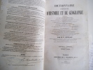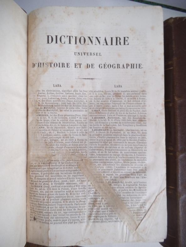 Dictionnaire universel d’histoire et de géographie contenant 1) l’histoire proprement dite2) La biographie universelle 3) la mythologie 4) la géographie anciennement moderne. Nouvelle édition augmentée d’un supplément mis, entièrement à jour ; paris Librairie Hachette & Cie 1854. Fort volume in 8 demi cuir vert, titre caissons dorés. 170x225mm. faux –titre, titre, VIII, 1924 pages, texte sur 2 colonnes, supplément : titre 14 pages. Pages de gardes entièrement manuscrites. Coupes frottées, sinon bon exemplaire.