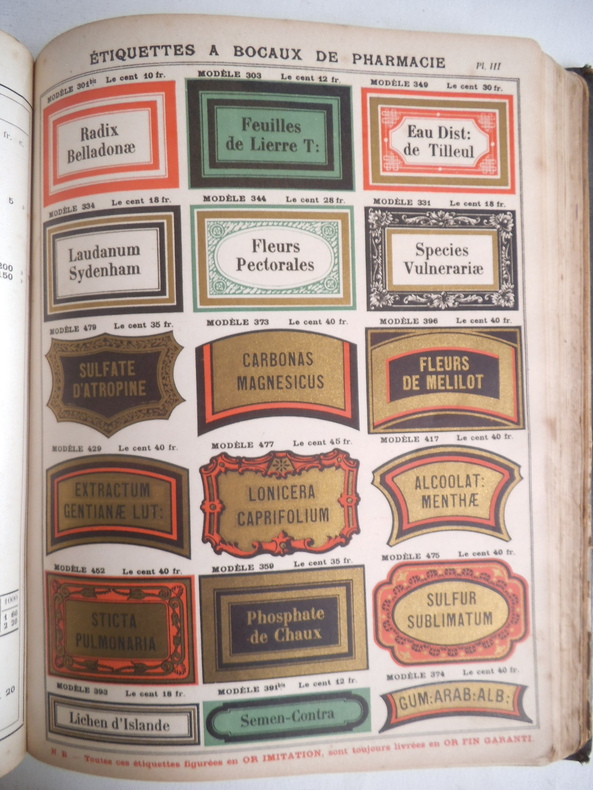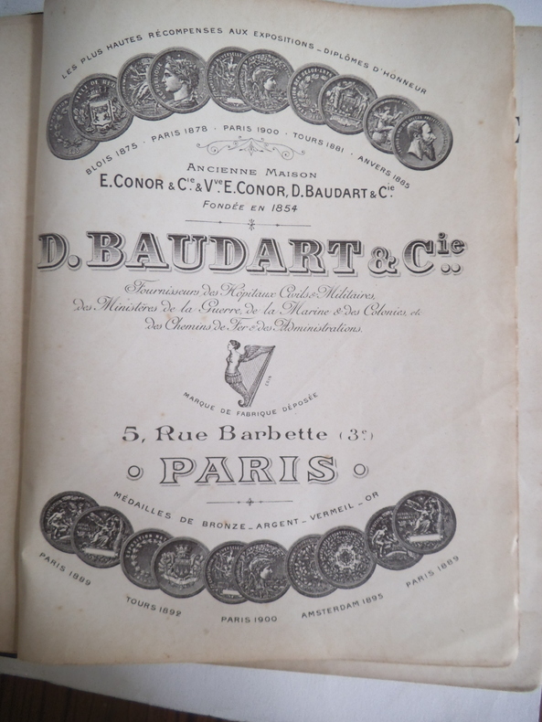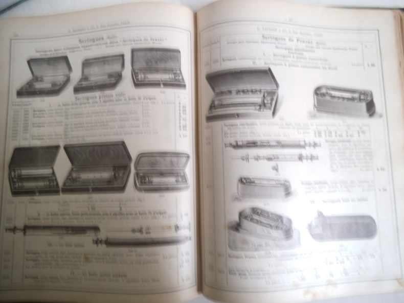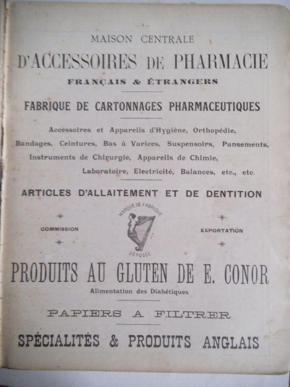 Fabrique de cartonnages pharmaceutiques,accessoires et appareils d'hygiène,orthopédie,bandages,ceintures,bas à varices,suspensoirs,pansements,instruments de chirurgie, appareils de chimie,laboratoire,électricité,etc.Articles d'allaitement et de dentition, produit au gluten de E. GENOR,papiers à filtrer,spécialité de produits anglais.Un volume in 4 280x220mm,reliure éditeur pleine toile noire, titre oxydé au premier plat,1 pages Avis,titre,402 pages, très nombreuses illustrations,32 pages de publicités sur papier rose.Sans date.Charnière fragiles,intérieur,très bon état.
