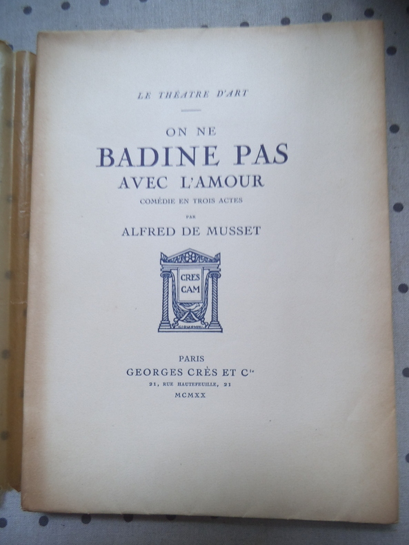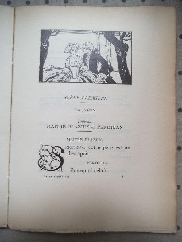 Comédie en 3 actes.In 12 broché,150x205mm.Couverture rempliée,faux-titre,frontispice illustré en couleurs de, titre orné d'une vignette,186 pages,compostions décoratives parG EORGE BARBIER gravées sur bois par Georges AUBERT. Paris Georges CRES & Cie 20 février 1920.Exemplaire numéroté sur papier de Rives.