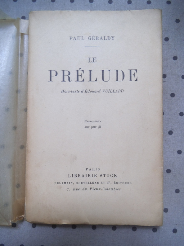 in 12 broché,120x190mm,couverture à rabats,frontispice sous serpente d'Edouard VUILLARD,titre,133 pages,édition originale numérotée sur vélin pur fil Lafuma Stock,5 décembre 1923.Très bon état