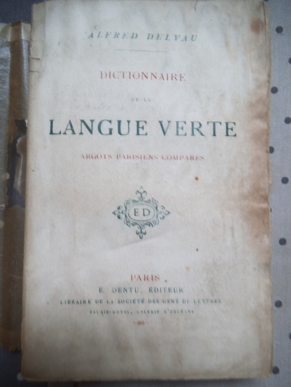 Dictionnaire de la langue verte.Argots parisiens comparés. In 12 broché,120x185mm,faux-titre,titre,XVI,406 pages,texte sur 2 colonnes.Trace d'humidité en marge extérieure page 280 à la fin. Paris E.Dentu éditeur 1866.Première édition.