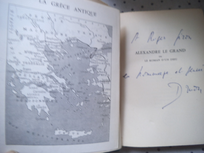 Edition originale, un des 160 exemplaires numérotés sur vélin lana, le nôtre un des 60 hors commerce, seuls grands papiers. Reliure en demi maroquin noir à grains longs, dos lisse, nom de l'auteur, titre de l'ouvrage, date et mention au palladium "EX. JOSEPH KESSEL 1958", plats de papier façon bois, gardes et contreplats de papier gris souris, couvertures et dos conservés, reliure signée Thomas Boichot. Quelques rousseurs affectant principalement les plats de couverture ainsi que premiers et derniers feuillets. Exceptionnel et émouvant envoi autographe signé de Maurice Druon à Joseph Kessel : "A toi mon grand Jef, cet Alexandre le grand né lui aussi sous le signe du Lion en même temps que du Bélier et que tu as aidé de tes conseils et de ton exemple en t'embrassant très fort. Maurice Juin 58." - Photographies et détails sur www.Edition-Originale.com -