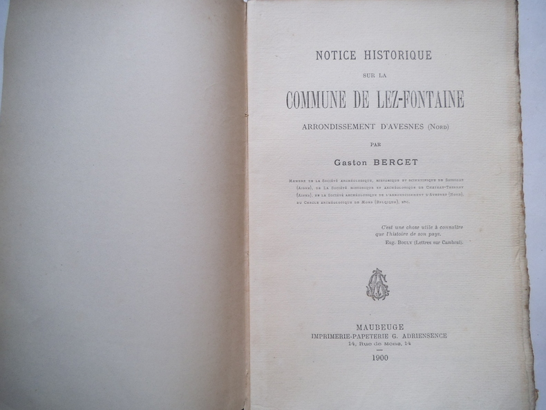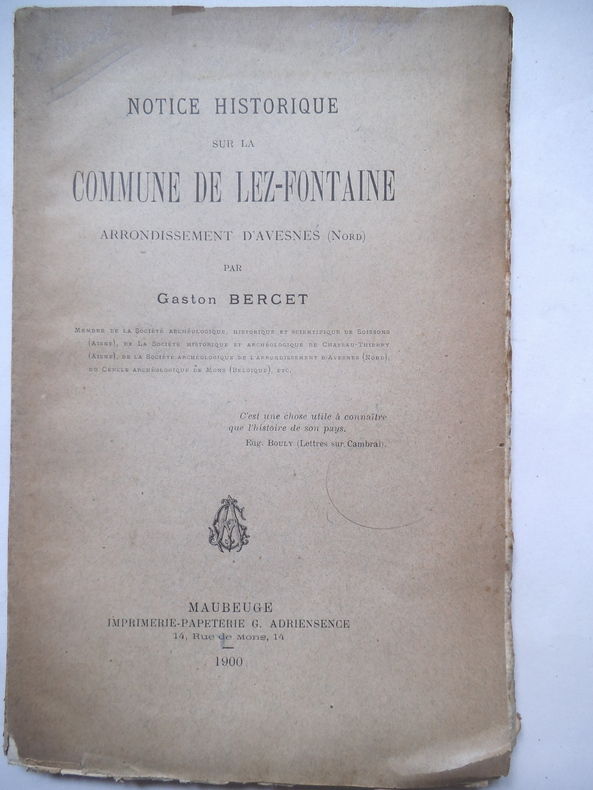 Notice historique sur la commune de LA ROUILLIES arrondissement d'AVESNES Nord)In 8 broché,245x160mm;titre, 66 pages,Maubeuge imprimerie papeterie G.ADRRIENSENCE 1900. exemplaire sur vergé hollande non justifié.Dos avec titre imprimé en long,cassé,intérieur très bon état,édition originale rare.