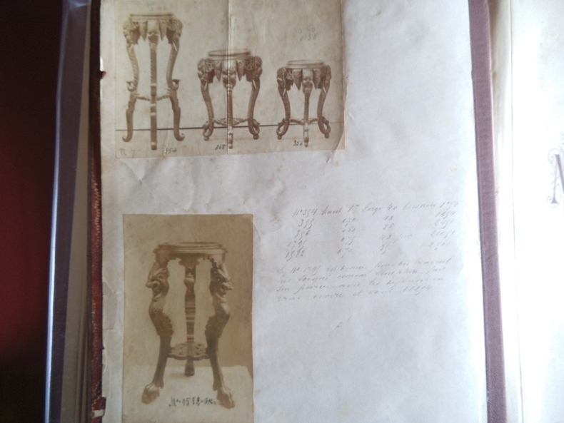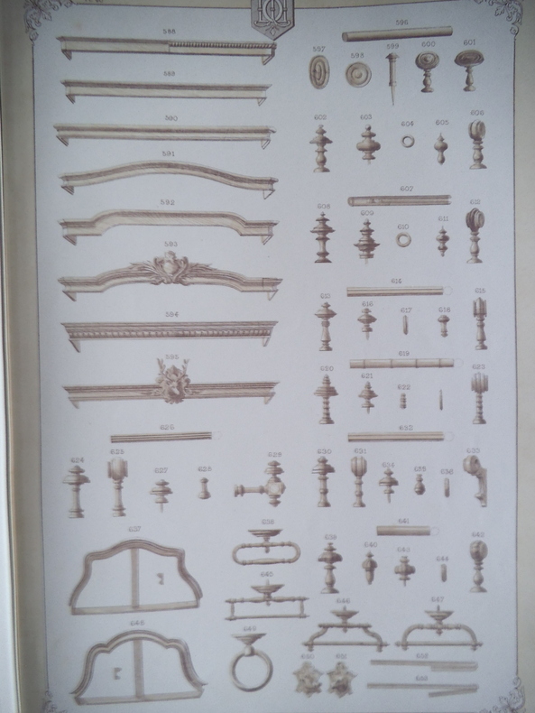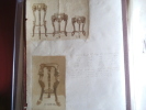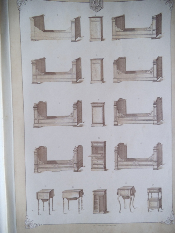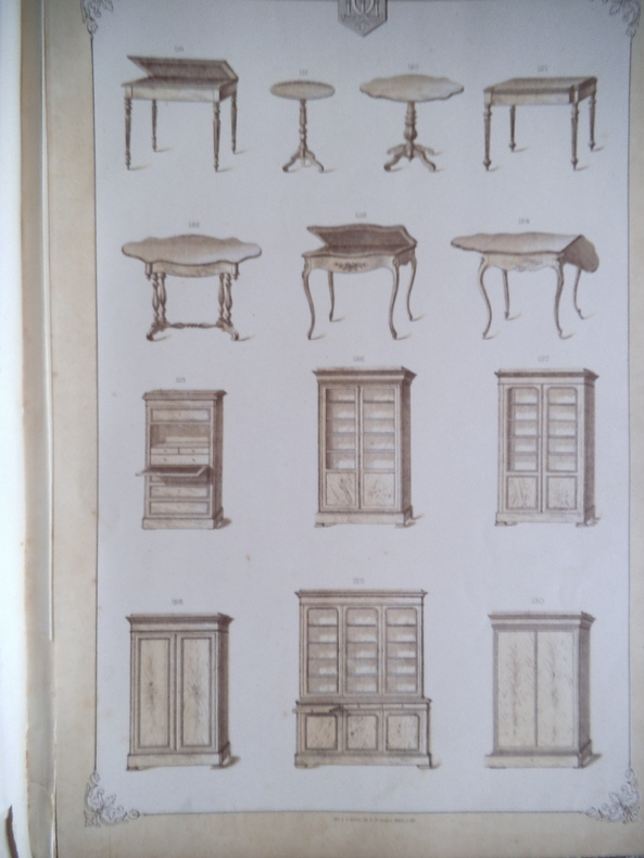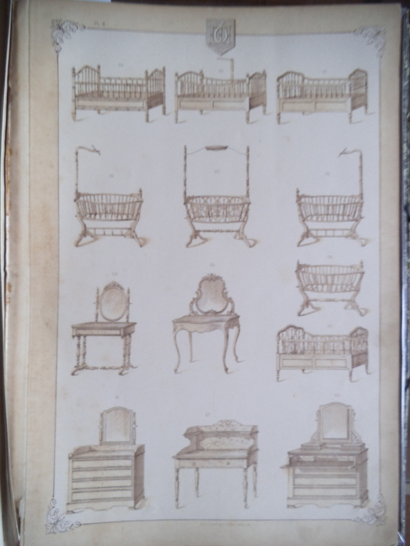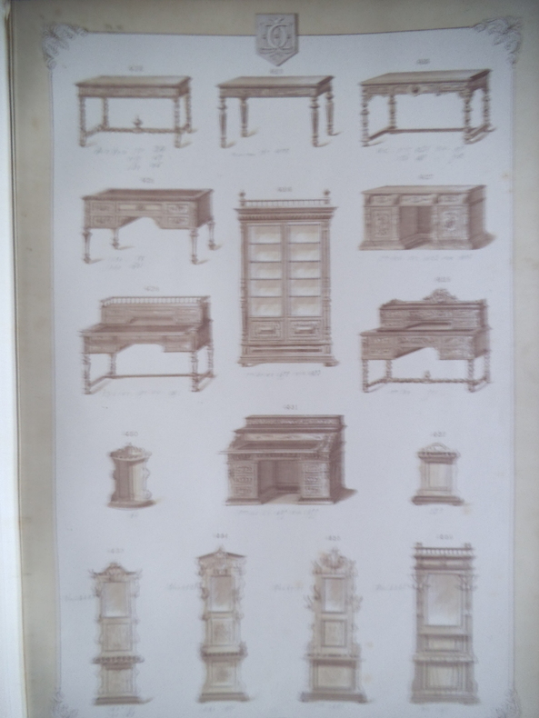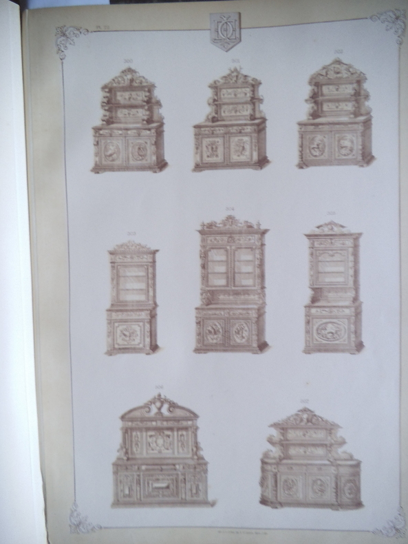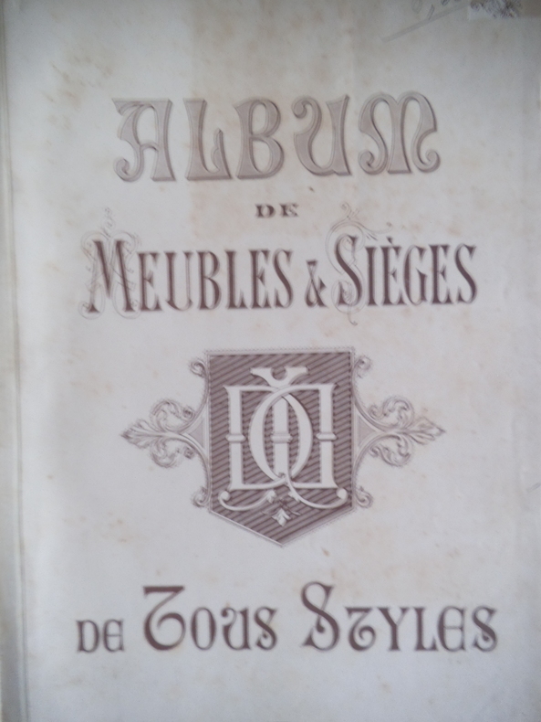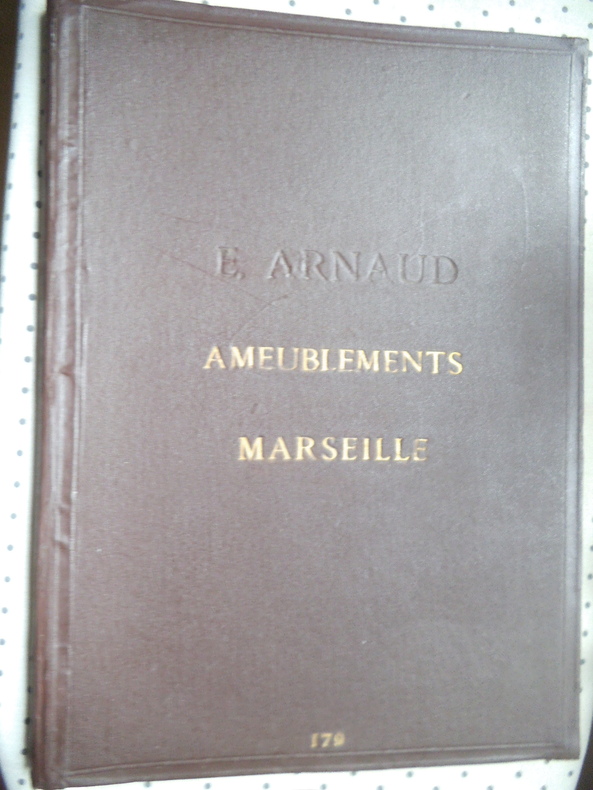 Catalogue ameublement in folio pleine toile de l'éditeur, titre doré au premier plat.330X455mm,titre et suite de 54 planches lithographiées(recto uniquement)Imprimerie Camis Paris.Catalogue de la maison ARNAUD à MARSEILLE.Sans date (fin XIXème) Buffets,chaises,sellettes,bois de lits,etc. gravures sur bois ajoutées et contrecollées au verso des planches 52,53 et 54 et sur pages de gardes; 2 photos originales des sellettes contrecollées au verso de la première page de garde.Ouvrage habilement restauré. Rare.