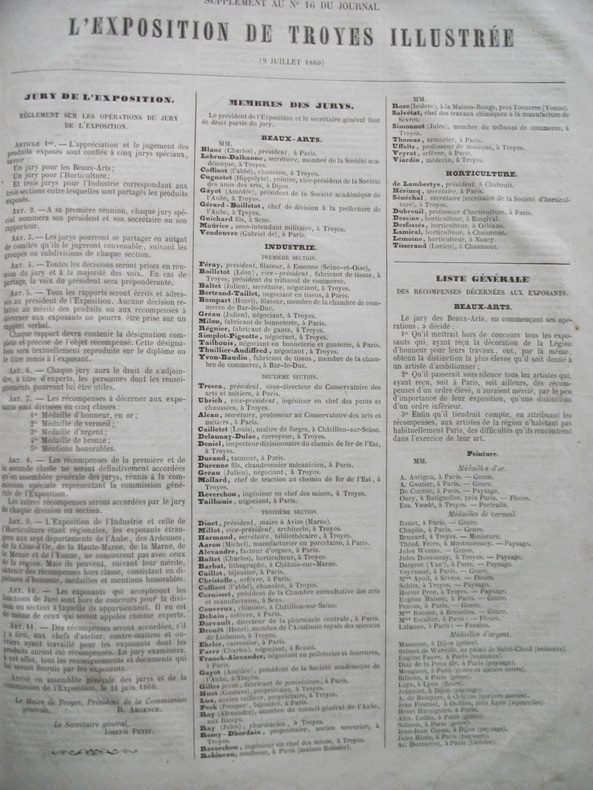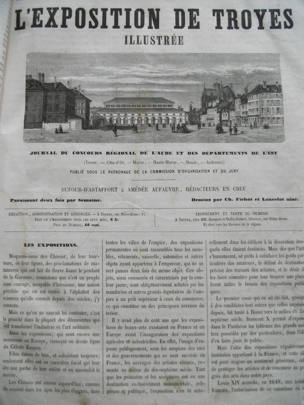 Journal du concours régional de l’Aube et des départements de l’Est:Yonne,côte d’or,Marne,Haute Marne,Meuse,Ardennes, publié sous le patronage de la commission d’organisation et du Jury In folio demi-cuir bleu foncé époque,titre et filets dorés.Collection complète des 16 numéros parus,de 8 pages chacun.Titre et illustrations dans le texte par Ch FICHOT et LANCELOT Ainé.Texte sur 3 colonnes n°1 du 10 mai 1860 au n°16 du 9 juillet 1860.Coiffe supérieure réparée. Quelques petites traces de manipulations.Bon état d’ensemble.Peu courant