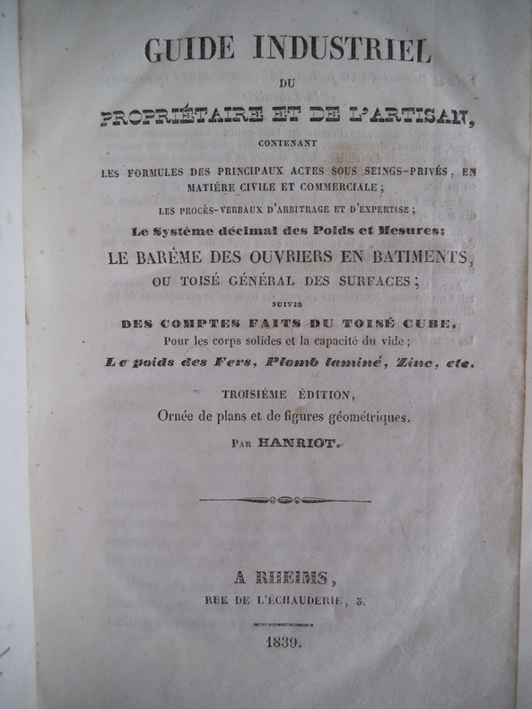 contenant les formules des principaux actes sous seings-privés,en matière civile et commerciale,les procès verbaux d’arbitrage et d’expertise;le système décimale poids et mesures,le barême des ouvriers en bâtiments,ou toisé général des surfaces suivis des comptes faits ou toisé, cubes, pour les corps solides et la capacité du vide. Le poids des fers, plombs,laminé,zinc,etc.troisième édition ornée de planches,de figures géométriques.In 8 demi-cuir marron époque,titre et filets dorés,faux-titre,titre,427 pages,2 tableaux dépliants en regard de la page 204, Nombreuses figures en 4 planches dépliantes,en fin de volume,A Rheims rue de l’échauderie 3,1839.Quelques plissures,sans gravité,aux tableaux,sinon bon exemplaire.