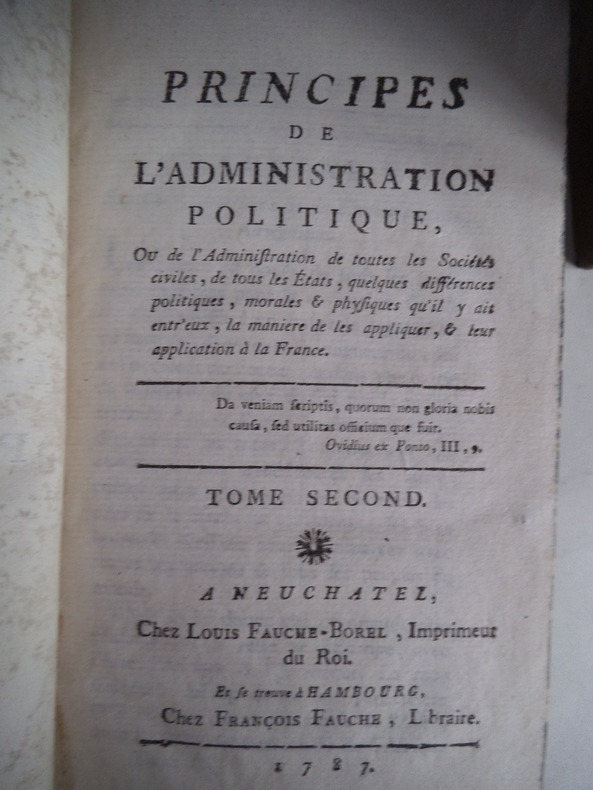 Principes de l’administration politique ou de l’administration de toutes les Sociétés civiles, de tous les Etats, quelques différences politiques, morales & physiques qu’il y ait entr’eux, la manière des les appliquer & leur application à la France3 tomes en 2 volumes in 8 plein cuir fauve à nerfs raciné,pièce de titre et tomaison chagrin rouge.fers, filets dorés.Faux-titre,titre,titre375,418 et 235 pages. tranches marbrées.Neufchâtel Fauche- Borel 1787.