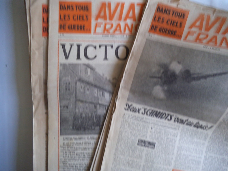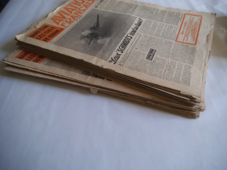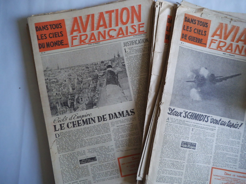 réunion de 47 numéros,Année 1945 n°6(un manque de papier aux pages intérieures) 7,8,9,11,12,13,14,16,17,18, (du 6 juin premier anniversaire du débarquement)19 20 21 22 23 24 25 27 31 32 (un manque de papier au premier plat) 33 34 35 36 37 38 39 40 41 42 43 44 45 46 47 Année 1946 n°48 du 2 janvier, 49 50 51 52 53 54 55 56 57 58(une déchirure latérale à tout le numéro) 59 du 20 mars.Revue hebdomadaire sur l’actualité de l’aviation,texte sur 4 colonnes avec illustrations,publiée du 7 février 1945 au 12 mai 1948. Issue directement des ailes françaises. 8 pages puis 12 pages. Porte la mention"dans les ciels de guerre" du n°3 jusqu’u n°15 puis "dans les ciels du monde".Office Français d’éditions.