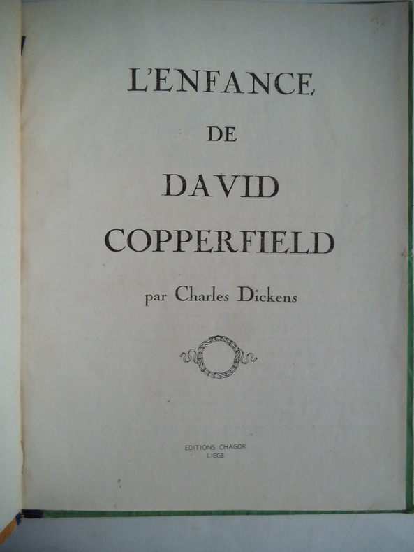In 4 cartonné, dos pincé papier bleu, premier plat illustré en couleurs, titre (l’enfance de David COPPERFIELD) 78 pages illustrations en noir dans le texte, et hors-texte, en couleurs, sur papier couché. de Jacques TOUCHET. Editions Chagor Liège sans date, petites rousseurs au deuxième plat ,un coin légèrement émoussé