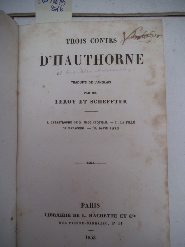 Trois contes d’HAUTHORNE traduits de l’anglais par MM. Leroy et Shceffer I) Catastrophe de M. Higginbotham II) la fille de Rapaccini III) David Swan. In 12 demi-toile lie de vin, titre et filets dorés, filets à froid. Faux-titre, titre, 345 pages, Paris L. Hachette 1853. Suivis de anecdotes historiques et littéraires racontées par l’Etoile, Brantome, Tallemant des R&aux, Saint Simon, Grimm etc. Faux-titre, titre, 198 pages, Hachette & Cie 1866. Rousseurs en début et fin de volume