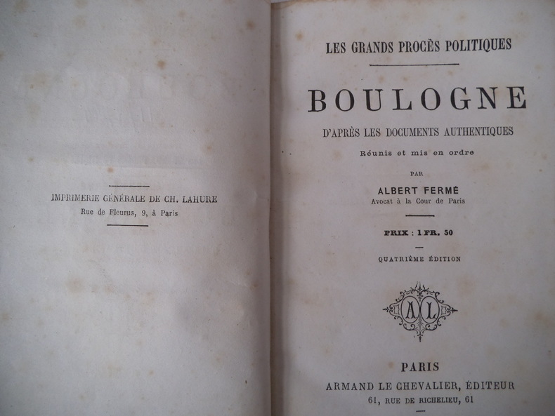 d’après les documents authentiques réunis et mis en ordre par Albert FERME.Les grands procès politiques. Faux-titre, titre, 212 pages,Paris Armand Le CHEVALIER éditeur 1869. In 12 pleine toile marron muette, époque.lL tentative de Louis Napoléon Bonaparte de revenir en France en 1840