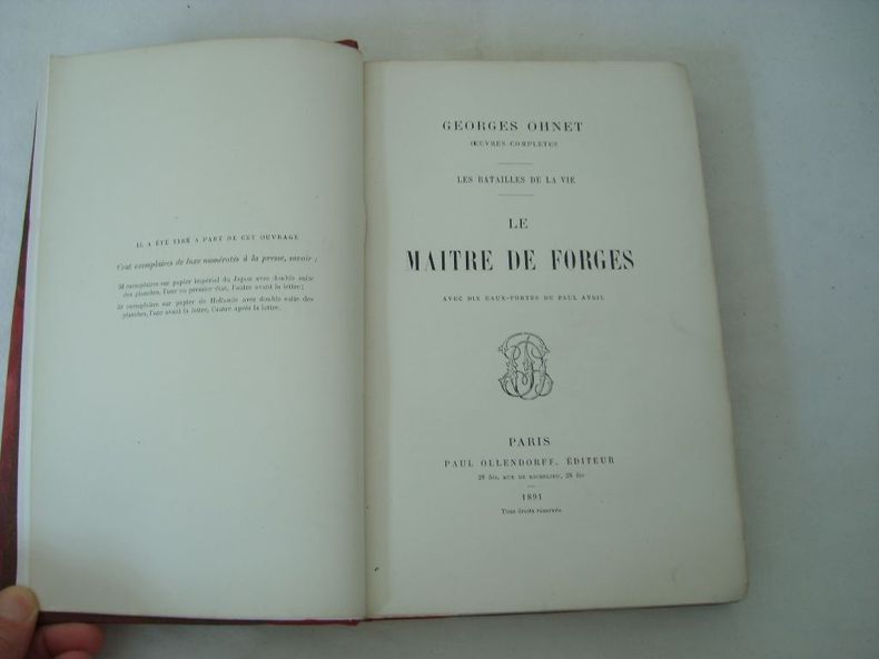 Paris, Paul Ollendorff, 1884 1 volume in-18 (19,5 x 12,5 cm) de (4)-403 pages. Reliure de l'époque demi-maroquin prune, dos à nerfs, auteur, titre et millésime dorés, tête dorée, non rogné pour les autres tranches, couvertures jaunes imprimées conservées (les deux plats et le dos). Reliure signée DUPRÉ. Très bel état de conservation. Nouvelle édition. Tirage de luxe à 50 exemplaires sur papier de Hollande (n°36) numérotés au composteur. L'édition originale du roman le plus célèbre de l'auteur a paru en 1882. Il s'agit ici d'une nouvelle édition parue peu après la sortie de l'adaptation théâtrale qui connut un énorme succès. C'est une histoire sentimentale se déroulant dans un cadre bourgeois, utilisant les recettes du mélodrame et du feuilleton. Le Maître de forges a été adapté pour le théâtre par Ohnet lui-même dès l'année suivante (1883). Créée au théâtre du Gymnase, la pièce connaîtra la célébrité, avec plus de 271 représentations en quelques mois : « un immense succès d’intérêt, d’émotions et de larmes », écrira-t-on dans Le Figaro le lendemain de la première[réf. nécessaire]. Succès qui dépassera même les frontières de la France puisque la pièce sera jouée à Saint-Pétersbourg et à Londres. Quatre familles sont mises en scène, de Beaulieu, noblesse dont la ruine subite intervient au début du film, Derblay, industriel historique maitre de forges, de Bligny, grande noblesse oisive et dépensière, et Moulinet, très riche industriel parvenu et sans éducation. Entre ces personnages va se jouer un ballet de calculs matrimoniaux, d'espoir déçus, de regrets, de tromperies, de résignation, de jalousie et de perfidie. Claire de Beaulieu, riche héritière, devait épouser le duc de Bligny, mais apprenant sa ruine, le duc s'écarte d'elle et préfère la riche Athénaïs Moulinet dont le père, jouant de sa fortune, ferait tout pour accéder au beau monde. Claire, qui est tenue ignorante de sa ruine, accepte par dépit la demande en mariage de Philippe Derblay. Claire et Athénaïs se sont connues adolescentes en pension et ont toujours été rivales. Claire n'aime pas Philippe et ce dernier est déçu de ce mariage, ils vont vivre sans se parler, mais peu à peu Claire se rapproche de lui jusqu'à comprendre sa grandeur d'âme. Georges Ohnet (1848-1918) tout d'abord journaliste et auteur de théâtre, c'est en écrivant la saga "Les batailles de la vie" qu'il rencontra le succès. Le maître de forges et La grande Marnière sont parmi les plus connus et furent tirés à très grand nombre. Ont dit de lui qu'il fut en quelque sorte un Anti-Zola par la forme et les thématiques. Ohnet fut l'historiographe de la bourgeoisie française et de l'aristocratie quand Zola décrivait les mineurs de fond et les filles de rien. Les critiques lui ont reproché des longueurs dans les descriptions qu'il fait (on pourrait dire la même chose de Zola) et quelques platitudes. Jules Lemaître s'exprime ainsi à son sujet : "Les quelques qualités de ces romans, étant purement scéniques, échappent à la lecture. On y trouve, en revanche, l'élégance des chromolithographies, la noblesse des sujets de pendule, les effets de cuisse des cabotins, l'optimisme des nigauds, le sentimentalisme des romances, la distinction comme la conçoivent les filles de concierge, la haute vie comme la rêve Emma Bovary, le beau style comme le comprend M. Homais. C'est du Feuillet sans grâce ni délicatesse, du Cherbuliez sans esprit ni philosophie, du Theuriet sans poésie ni franchise : de la triple essence de banalité." (Les Contemporains. Études et portraits littéraires, première série, Paris, librairie H. Lecène et H. Oudin, 1886, p. 354.). On sait ce qu'il reste de l'oeuvre de Jules Lemaître ... Le Maître de Forges a été adapté au cinéma par Fernand Rivers et Abel Gance en 1933, avec Gaby Morlay dans le rôle principal. Un premier film muet était sorti dès 1912. Bel exemplaire très bien établi par Dupré.