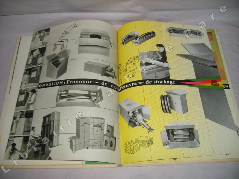 Vitry-sur-Seine, L'Ondulium, sans date, 24 X 32 cm., broché, 20 feuillets non chiffrés. Plaquette éditée à l'occasion du cinquantième anniversaire de la fondation de L'Ondulium, société fabriquant des caisses et emballages en carton ondulé. Illustrations en noir et couleurs. Couverture recto ondulée, comme il se doit, et illustrée. Traces légères sur les couvertures, marque de trombone sur la seconde de couverture et la garde de couleur. Sinon en bon état.