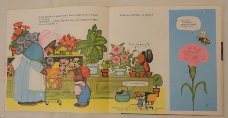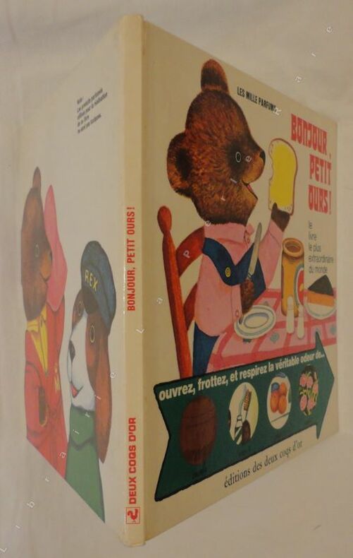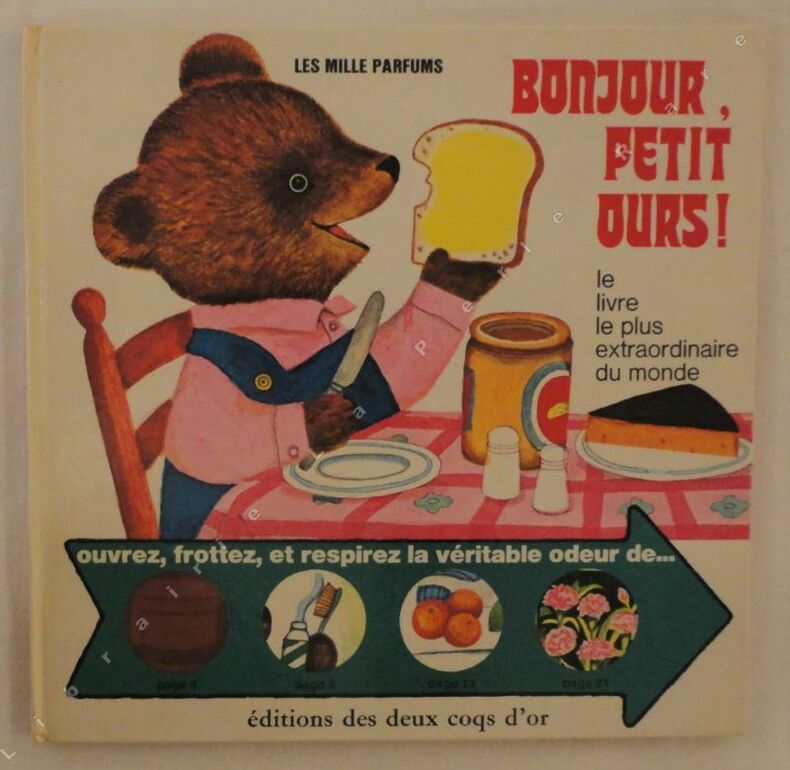 Sans lieu, Editions des deux coqs d'or, 1976, 23 X 23 cm., cartonné, 21 pages. Collection Les Mille Parfums. Gratter des vignettes permettait de respirer de bonnes odeurs. Près de cinquante ans plus tard, les odeurs se sont envolées, mais il reste les charmantes images en couleurs de John Parr MILLER. Ouvrage rare et en bon état.