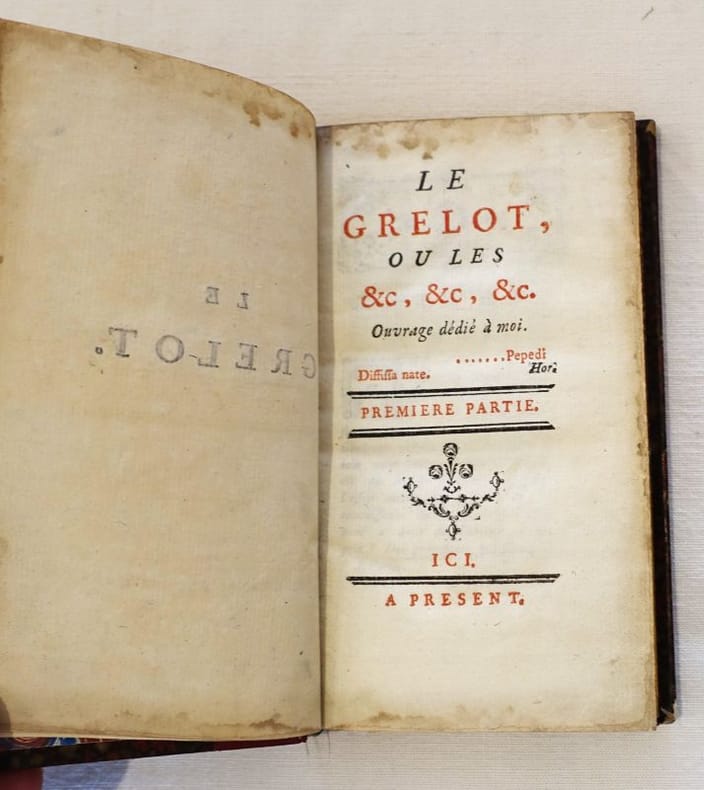 Ici, [sans mention d'éditeur,] à présent [1754], 9 X 15 cm., relié, 105 pages. Première édition peu courante. Demi-chagrin à nerfs XIXème, toutes tranches dorées. épidermures, coupes et coins émoussés. Mouillures en marge des premiers feuillets, petit manque en coin inférieur du dernier feuillet, traces éparses.