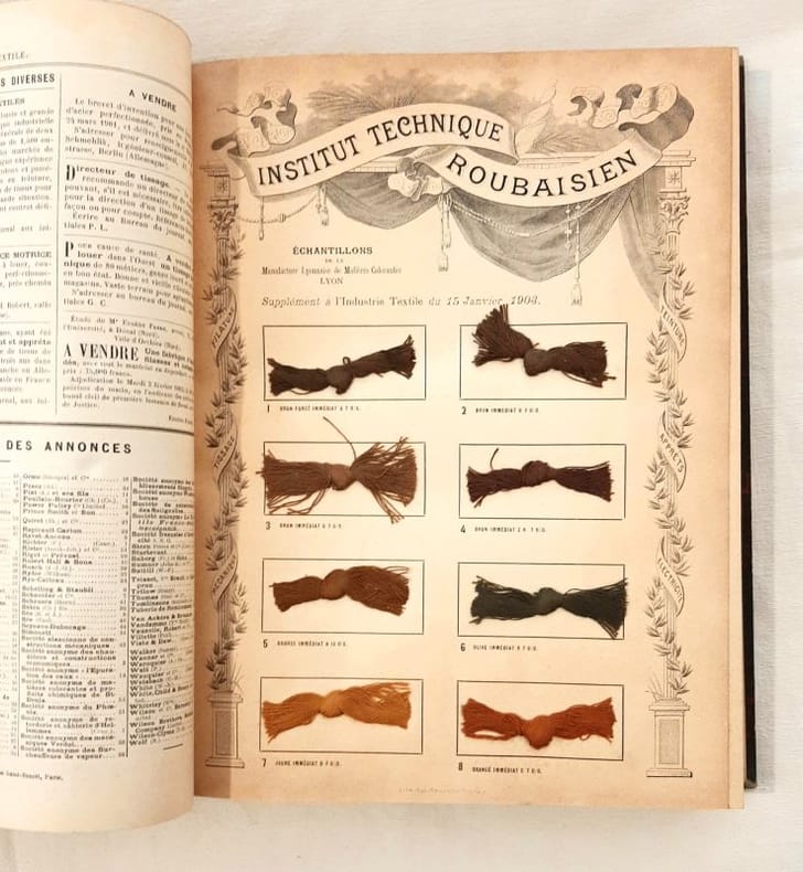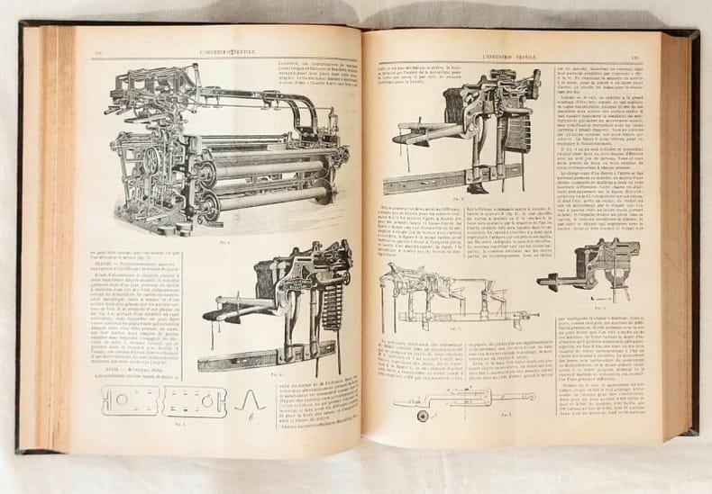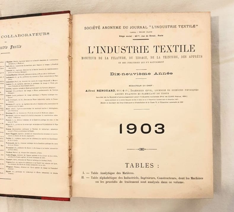 Paris, 24 X 32 cm., relié, XII-488-52 pages Revue générale mensuelle paraissant le 15 de chaque mois. Reliure demi-percaline éditeur incluant tous les numéros de l'année 1903. Table analytique des matières en début d'ouvrage. Une planche d'échantillons de l'Institut Technique Roubaisien, 54 pages de réclames, nombreux croquis et modèles de tissus. Reliure usagée mais solide, intérieur propre. Ensemble peu courant.