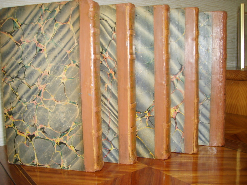 Paris, Lefèvre, 1823, 5 tomes, 13 X 21 cm. Reliés, 460 + 403 + 562 + 578 + 466 pp. Avec les notes de tous les commentateurs. Frontispice dans le tome 1. Demi-veaux, dos à nerfs ornés à froid et à l'or, tranches marbrées. Reliures grossièrement consolidées, plusieurs mors fendus, un dos cassé et plusieurs plats séparés, rousseurs éparses, petits manques sur une garde du tome 2.