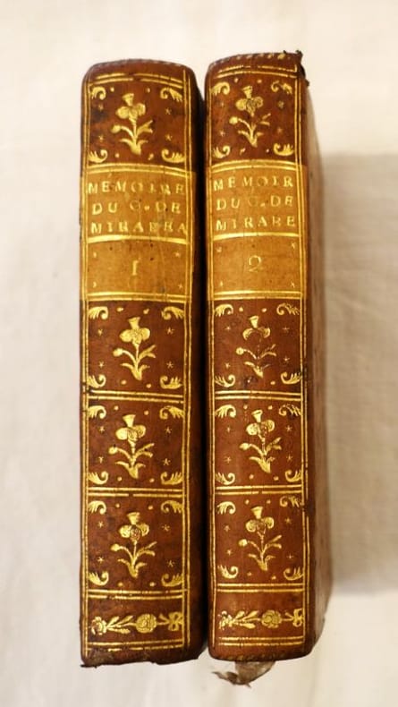 Le premier volume contient "Mémoire à consulter et consultation pour madame la comtesse de Mirabeau" - "Requête de madame de Mirabeau à nosseigneurs du parlement" - "Requête du comte de Mirabeau à nosseigneurs du parlement" - "Observations pour le comte de Mirabeau" - "Plaidoyer par le comte de Mirabeau". Dans le deuxième volume, se trouvent "Observations du comte de Mirabeau", signé par Honoré-Gabriel de Riqueti, comte de Mirabeau, fils, et Jaubert, avocat, et "Consultation pour le comte de Mirabeau" signé : Jaubert. Ouvrages retraçant la demande en séparation de corps de la comtesse de Mirabeau lors d'un procès retentissant dans lequel son époux défend sa propre cause.