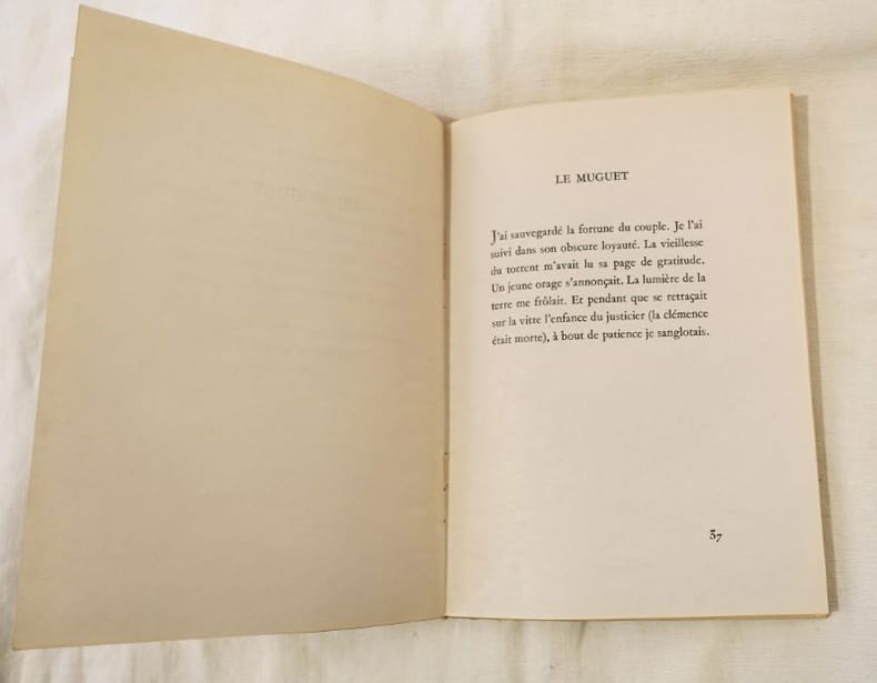 ed. Fontaine 1947 grand in-8 br., «De si loin que je me souvienne, je me distingue penche sur les vegetaux du jardin desordonne de mon pere, attentif aux seves, baisait des yeux formes et couleurs que le vent semi-nocturne irriguait mieux que la main infirme des hommes», edition originale, ex. numerote sur simili Japon