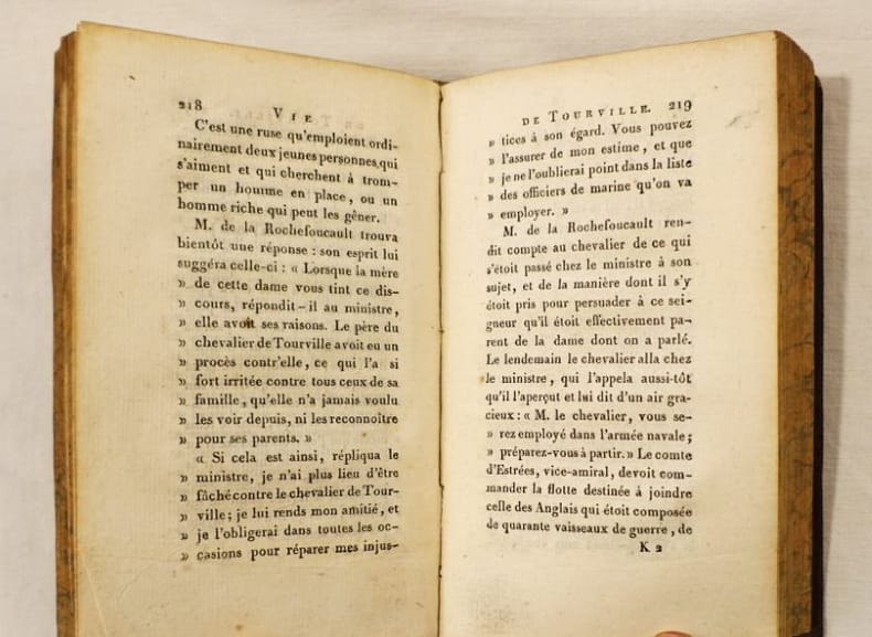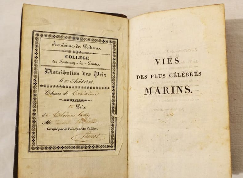 Paris, Volland le jeune, 1815, 2 tomes en un volume, 10 X 17 cm., relié, 239 - 230 pages. Quatrième édition, augmentée des vies du maréchal d'Estrées et de Bernard Renau. Par M. Richer. Collection des Vies des plus célèbres Marins. Plein veau, dos long orné, tranches marbrées, encadrement à la roulette sur les plats. Mors supérieur partiellement fendu, petit trou de vers en tête, légères épidermures. Cachet humide des oeuvres militaires de Fontenay-le-Comte. Quelques mouillures, très peu de rousseurs. Édition peu courante.