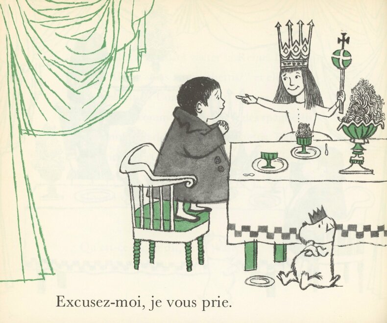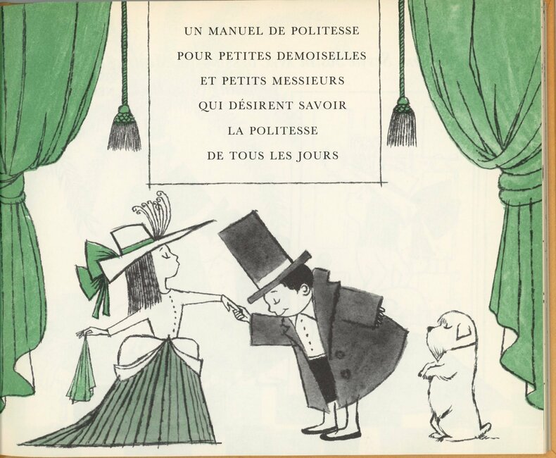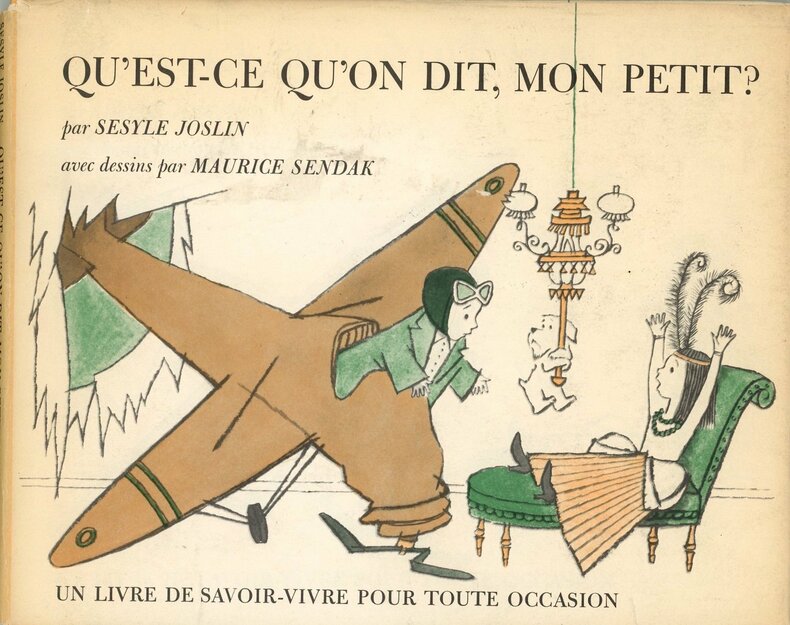 Rare première édition en français publiée aux Etats-Unis. Illustrations de Maurice Sendak (1928-2012), humoristiques et séduisantes planches en vert et noirs de différentes intensités. Ouvrage en français pour les petits Américains désireux d’apprendre, dans notre langue, la réponse appropriée aux situations irrésistibles imposées par le savoir-vivre. En parfaite condition.