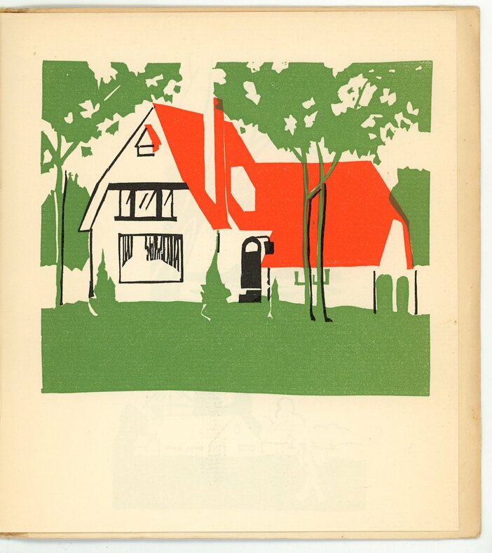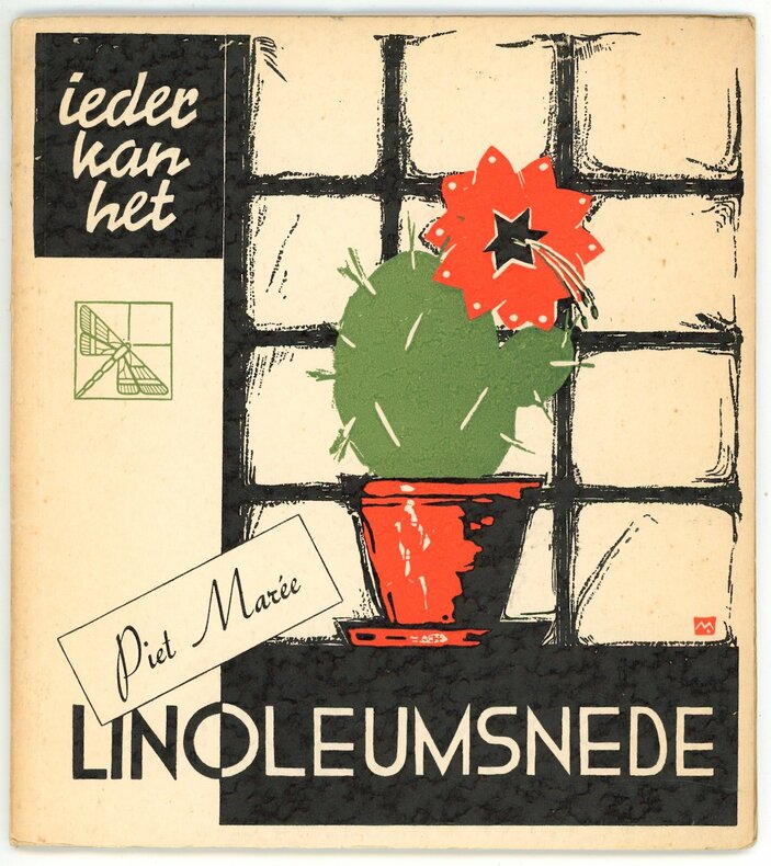 Handleiding tot het zelf snijden en afdrukken van linoleumsneden. Bosch & Keuning. Baarn. [Vers 1938]. Petit in-8 (19 x 17 cm). 32 pp. : couvertures souples, la première illustrée d’une linogravure en couleurs (Piet Marée).