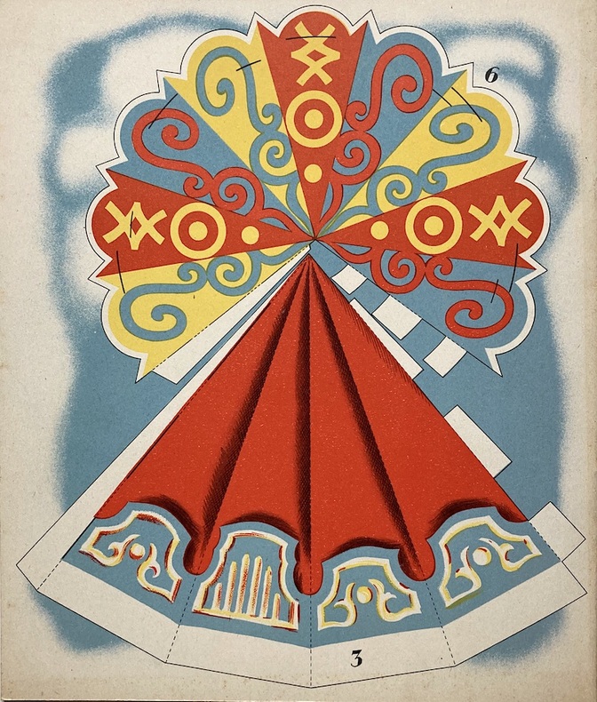 Un jeu de construction. D’après Pierre Belvès. Un album du Père Castor. Flammarion. [Paris. 1941]. In-4 (28 x 24 cm). 2 planches cartonnées doubles à découper : couvertures de papier fort illustrées en couleurs un manège au centre d’une fête foraine, sur la première, chapiteau du manège à découper sur la seconde.