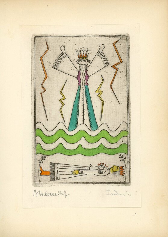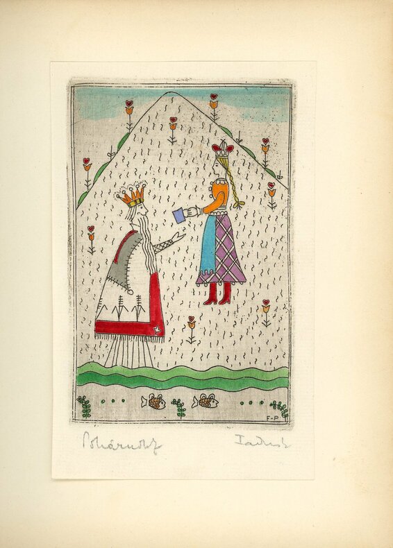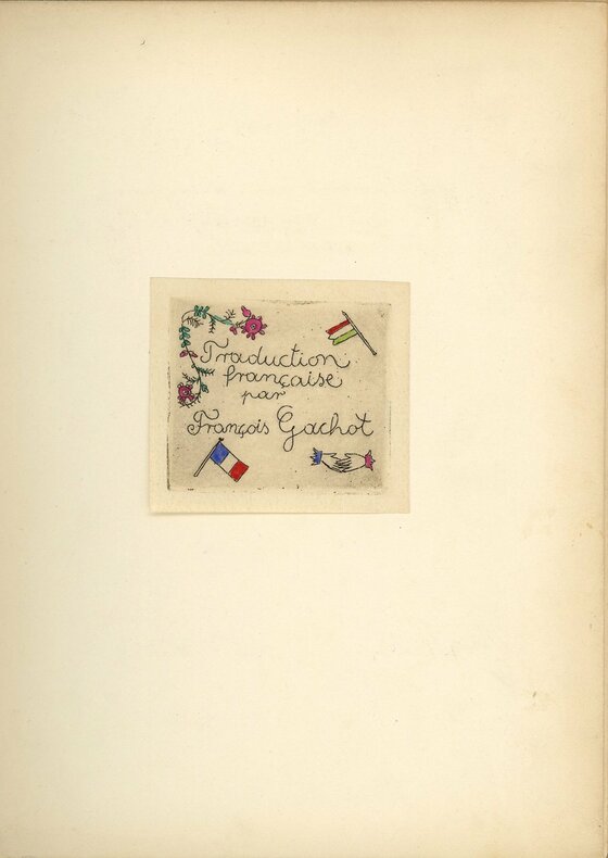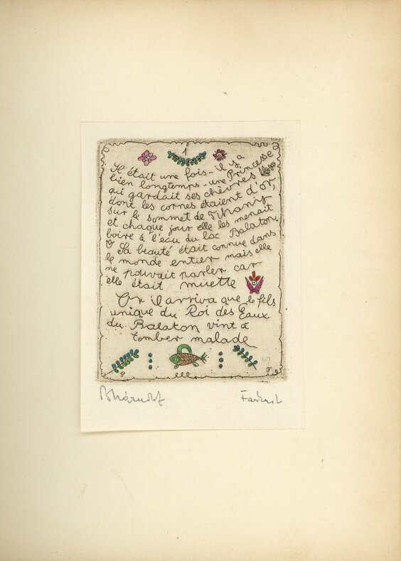 Unique édition recherchée. Séduisante réalisation hongroise écrite en français et composée de quatorze eaux-fortes coloriées à la main – non comprises les deux gravures illustrées portant le titre et le nom du traducteur, où sont associés drapeau hongrois, drapeau français et mains serrées. Œuvre de deux peintres de Budapest, Lidia Farkas (1910-1985) et Zoltan Poharnok (1905-1976). Six planches de texte gravé, calligraphié et orné, et six planches (14 x 9 cm) illustrant les épisodes du conte. Fines gravures délicates, imagerie hongroise revisitée par un style très personnel, moderne et naïf à la fois. Conte du prince amoureux de la méchante princesse, celle qui conduit ses chèvres aux cornes d’or se désaltérer dans les eaux du lac Balaton. Traduction par le professeur, diplomate et écrivain proche de la NRF François Gachot (1901-1986). Il vécut en Hongrie de 1924 jusqu’à son expulsion en 1949 et était proche des artistes hongrois. Les eaux-fortes sont toutes signées au crayon par les deux artistes et sont appliquées sur le recto des feuillets cartonnés par deux petits points de colle permettant de découvrir le tampon de l’atelier de Poharnok au verso. Rare et inhabituel. Aucune édition française mentionnée dans les bibliothèques référencées.