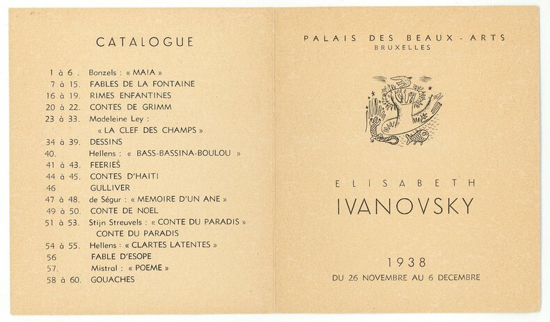 Rare catalogue d’une des premières expositions personnelles d’Elisabeth Ivanovsky (1910-2006) en 1938 à Bruxelles. Une première page comportant une vignette illustrée, deux pages de texte par le poète belge Paul Fierens (1895-1957) sur les livres et le talent de l’artiste et une dernière page de catalogue listant les soixante pièces exposées. Après “l’exposition du livre d’enfant illustré de toutes les nations de Prague de décembre 1937 à janvier 1938. Elle présente son travail au Palais des Beaux-Arts de Bruxelles. Le catalogue révèle nombre d’œuvres inédites, dont beaucoup seront dispersées.” Georges Meurant. Elisabeth Ivanovsky. Sur la page blanche tout est possible. MeMo. 2017. p. 76