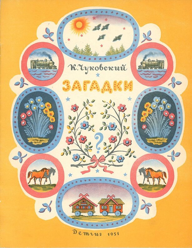 Travail d’avant-garde pour 14 planches-tableaux de devinettes. L’artiste Valery Sergeevitch Alfeevsky (1906-1989) suivit les cours des Vkhutemas puis des Vkhuteins avant de devenir un membre éminent de la société des peintres de chevalet. Comme souvent c’est la marche soviétique vers le progrès et la modernité qui sont mises en avant. Devinettes versifiées de Kornei Tchoukovski (1882-1969), la réponse étant inscrite à l’envers sur l’image. Travail sur la double page, souvent en réserve, diagonales et coloris différents à chaque feuillet. Deuxième édition. Intérieur du dos et de deux feuillets renforcés.