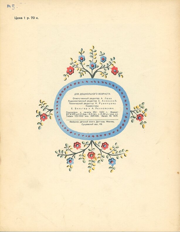 [Dessins V. Konachevitch. Detgiz. [Maison d’édition d’état. Littérature jeunesse du Ministère de l’éducation. RSFSR. Moscou. Leningrad.] 1951. In-4 (27,8 x 22,2 cm). 14 pp., première couverture comprise : couvertures de papier fort illustrées en couleurs imitant d’une façon moderne les loubki traditionnels, la première fond jaune d’or, la seconde fond blanc avec les mentions d’édition au centre.