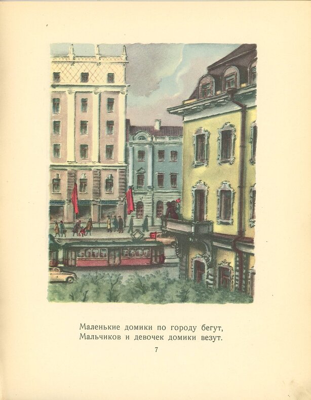 Dix planches originales en couleurs par Vladimr Konachevitch (1888-1963) et vers de l’écrivain Kornei Tchoukovsky (1882-1969). À mots couverts il décrit poétiquement les tableaux de son compatriote dans ses vers enjoués : “Les aigles du ciel sont les avions soviétiques, les petites maisons courantes les tramways, etc. Style des années cinquante, de talent mais politiquement correct par un Konachevitch obligé.