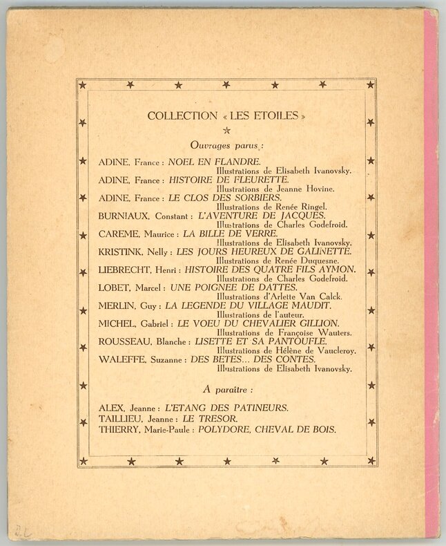 Illustré par Elisabeth Ivanovsky. La Renaissance du livre. Bruxelles. 1951. In-8 (22,3 x 18,5 cm). 99, (1) pp. 10 planches : couvertures cartonnées souples illustrées en rose, blanc et noir, titre de la collection sur la seconde.