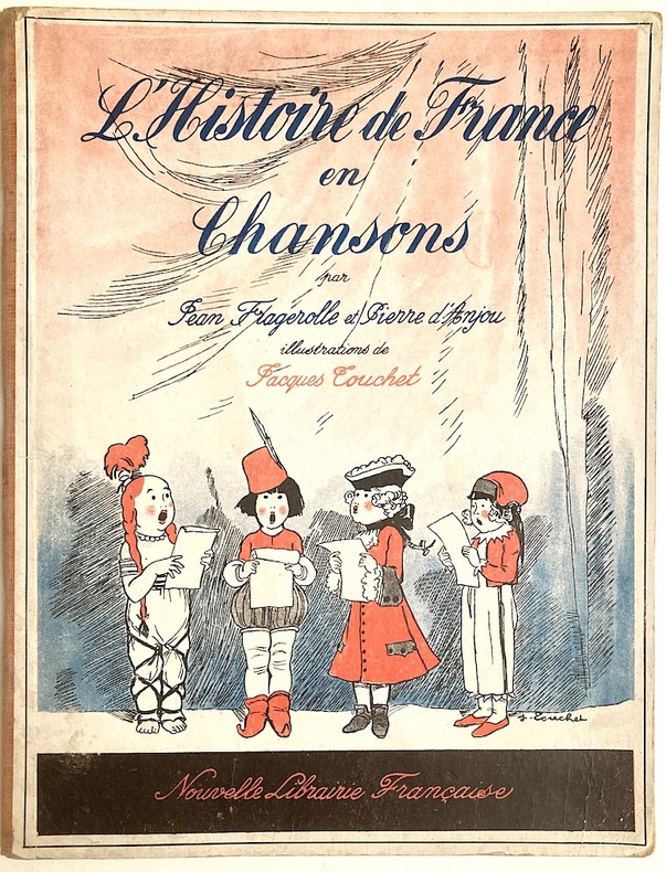 Textes de Pierre d’Anjou mis en musique par Jean Fragerolle illustrés par Jacques Touchet. Nouvelle Librairie Française. Paris. [1931]. Grand in-4 (31,5 x 24,5 cm). (26) pp. dos de toile rouge, plats cartonnés souples, le premier illustré en couleurs