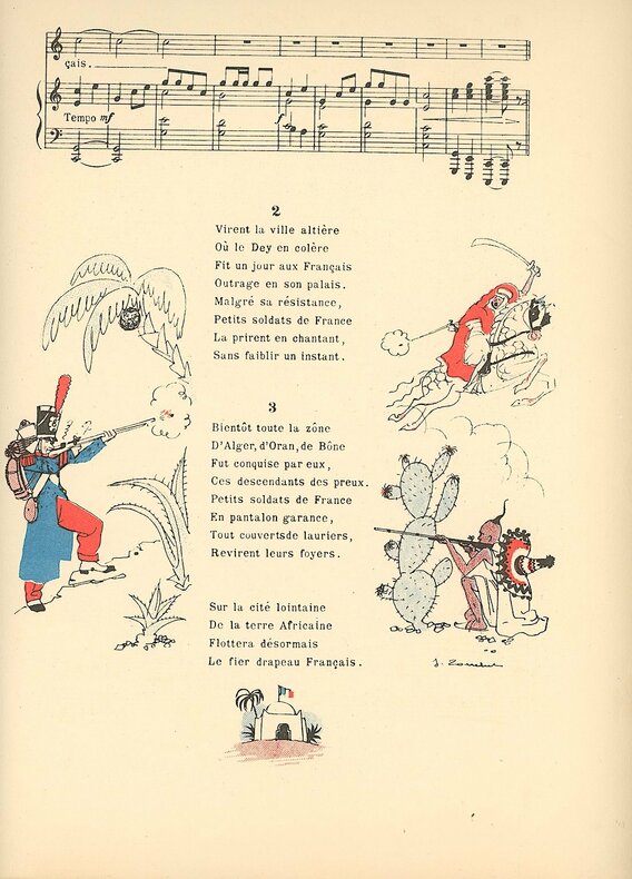 Douze doubles partitions illustrées par Jacques Touchet (1887-1949). Fines compositions à l’encre coloriées en bleu et rouge à chaque page. Douze doubles pages, une par chanson, avec sa partition, son histoire, en tête, et les refrains. Depuis Charles le Gros, au départ de La Fayette, campagnes de Napoléon et Restauration. Dos de toile un peu passé, sinon parfait état.