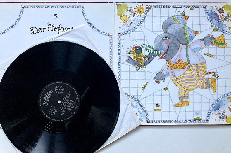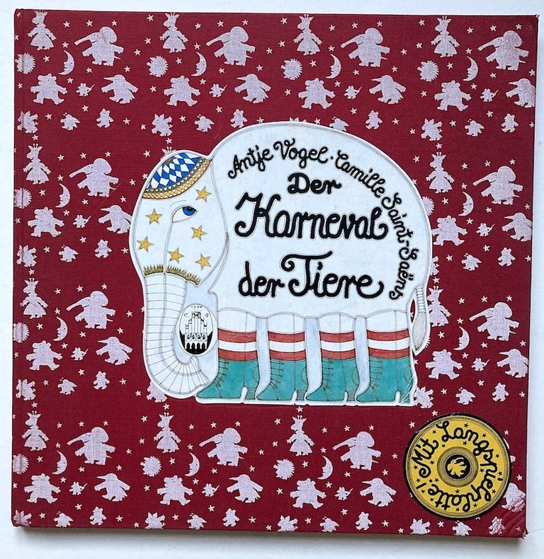 Premier tirage des larges et séduisantes illustrations de l’illustratrice et peintre allemande Antje Vogel, née en 1939. Aquarelles enjouées, stylisées, encadrement ornés sur la double page avec le texte en écriture cursive à gauche et l’illustration à droite. Une dernière page indique que l’on peut commander les illustrations du “Carnaval des animaux” à la Galerie des enfants à Münster. Bien complet de son disque 33 tours, également en parfaite condition, du Carnaval des animaux de Camille Saint-Saëns (1835-1921) par l’orchestre symphonique de Nuremberg sous la direction du chef d’orchestre suisse Urs Schneider.
