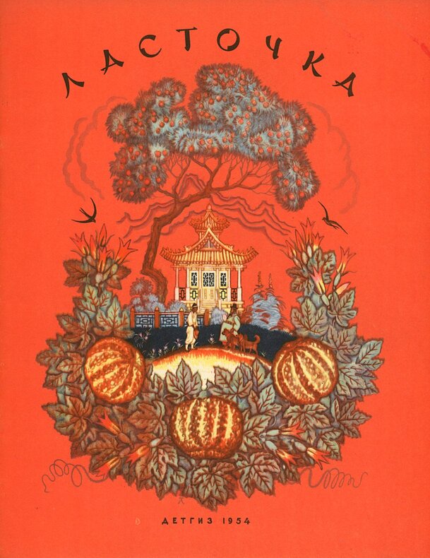 рисунки Н. Кочергина. [Dessins de N. Kotchergine. Compilé et raconté par V. Kutcheriavenko]. Detgiz. Moscou. Leningrad. 1954. [Signé pour la publication le 22 décembre 1953]. In-4 (28 x 22,3 cm). 15, (1) pp. : couvertures de papier fond rouge illustrées en couleurs de motifs asiatiques et d’hirondelles.