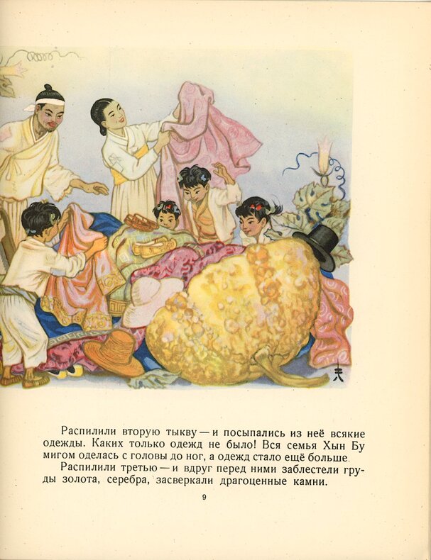 Premier tirage des illustrations de l’affichiste, illustrateur et sculpteur soviétique, artiste émérite de la RSFSR, Nikolaï Mikhaïlovitch Kotcherguine (1897-1974). Artiste majeur dans la création d’affiches de propagande, les fenêtres Rosta de l’agence TASS, il se consacra aux livres pour les enfants après la Seconde Guerre mondiale. Dans un style totalement différent, il illustre un conte coréen. Couvertures, seize compositions originales, dont la double page centrale, une lettrine ornée. L’histoire de l’hirondelle qui combla de bienfaits le frère pauvre et où les mêmes volatiles anéantirent le frère riche et sa mauvaise femme cupide. Un seul exemplaire, dans les bibliothèques référencées, à Stanford University, Cecil H. Green Library.
