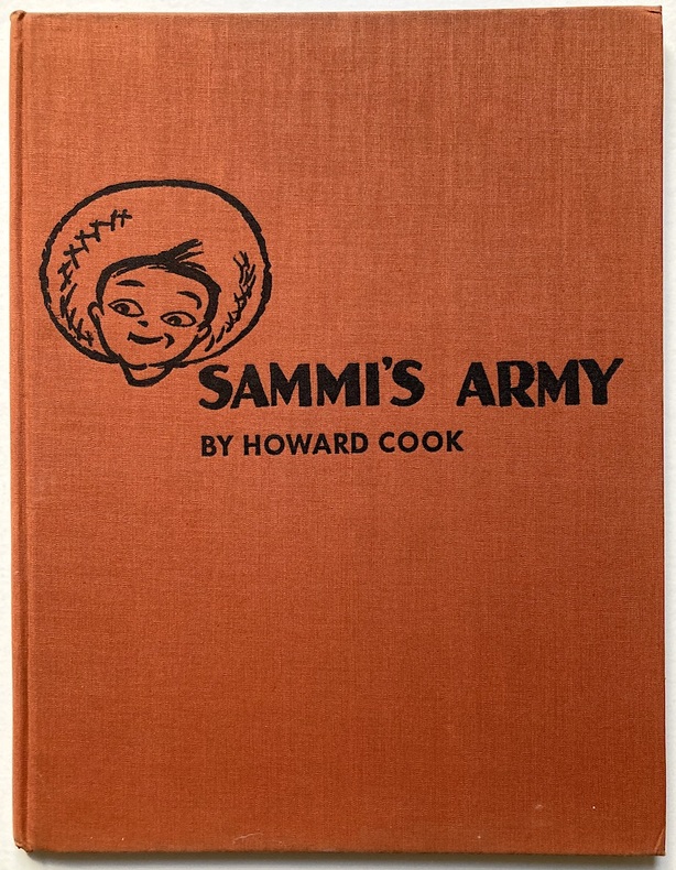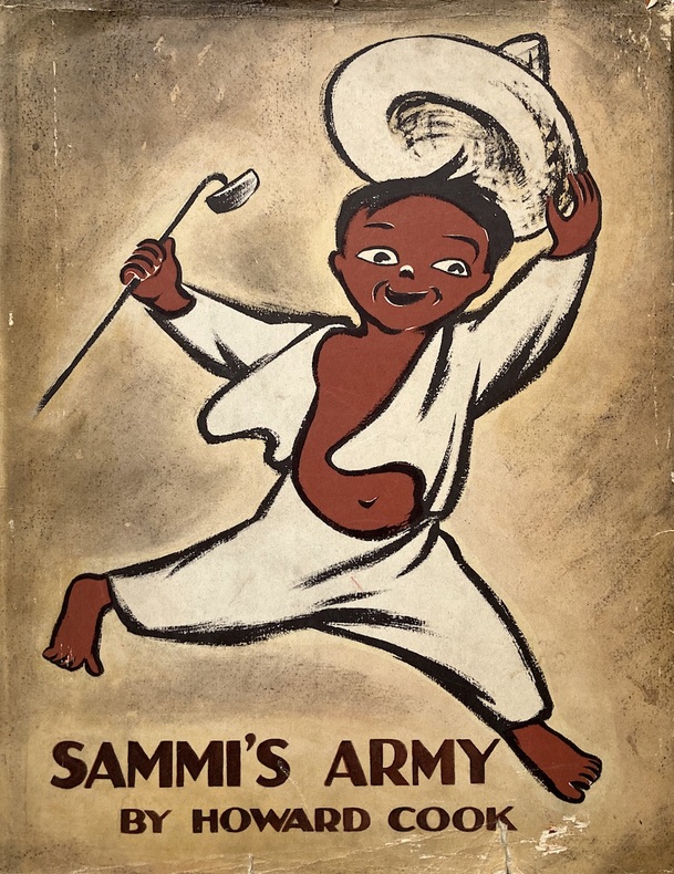 Première édition des très vivantes lithographies à pleine page par le peintre et graveur américain Howard Cook (1901-1980). Publié en temps de guerre afin que Sammi, avec ses très vivantes aventures, réconforte les jeunes Américains avec sa “Sunny and good nature”. Il va, en effet, ridiculiser et faire fuir les soldats étrangers – qui ressemblent fort à des Allemands. Quatre petites fentes en tête et en pied de la rare jaquette, sans manque. Ouvrage et cartonnage de toile en parfait état. De la collection Martin Kaiser.