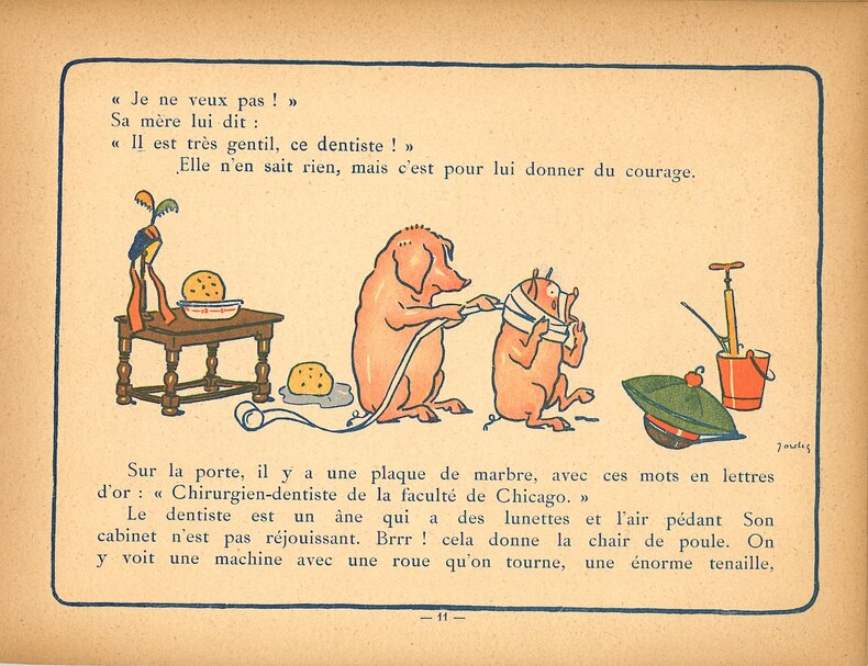 Première édition. Avec les illustrations à chaque page du célèbre illustrateur français Jordic (1876-1915, mort au combat). C’est l’histoire du petit cochon breton, cependant bien français. Bon état, dos frotté.