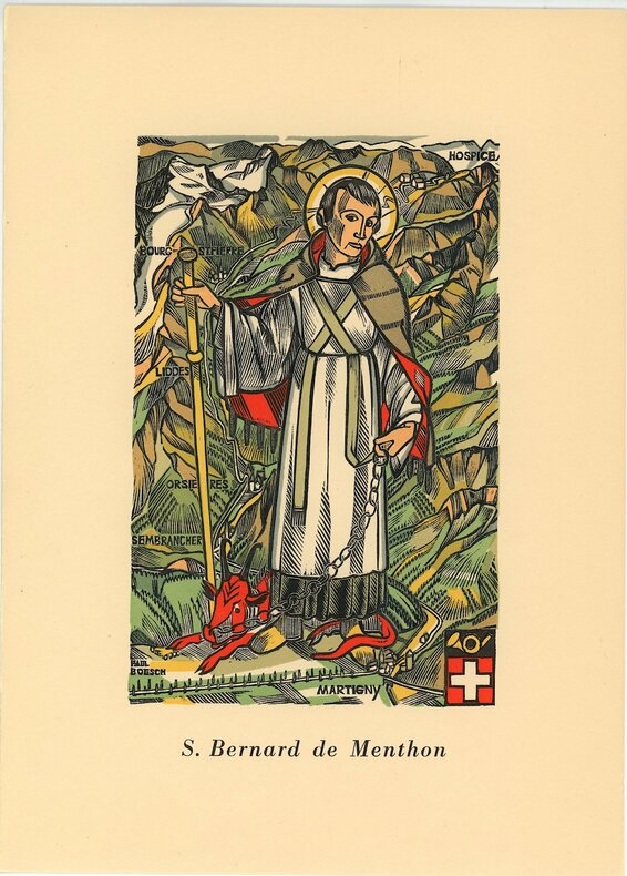 Lausanne / Berne, Roth & Sauter - Au Verseau / Direction générale des postes suisses, sans date. In-4 en feuilles, couverture ornée d'un bois gravé de Paul Boesch, à qui l'on doit aussi les 6 planches: Saint Jacques de Compostelle, Saint Gothard, Saint Bernard de Menthon, Saint Bernardin de Sienne, Saint Maurice et Le bienheureux Nicolas de Flüe. Préface de Paul Budry, texte du Chanoine Poncet avec sa traduction en anglais, les deux sur double feuillet. Petits accrocs en bords de la couverture, un petit trou circulaire (qui nous laisse perplexes) traverse chaque feuillet au même endroit.