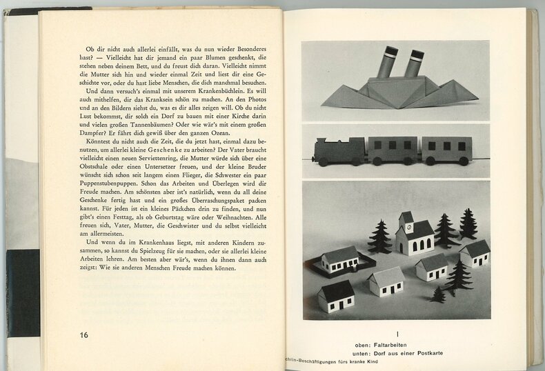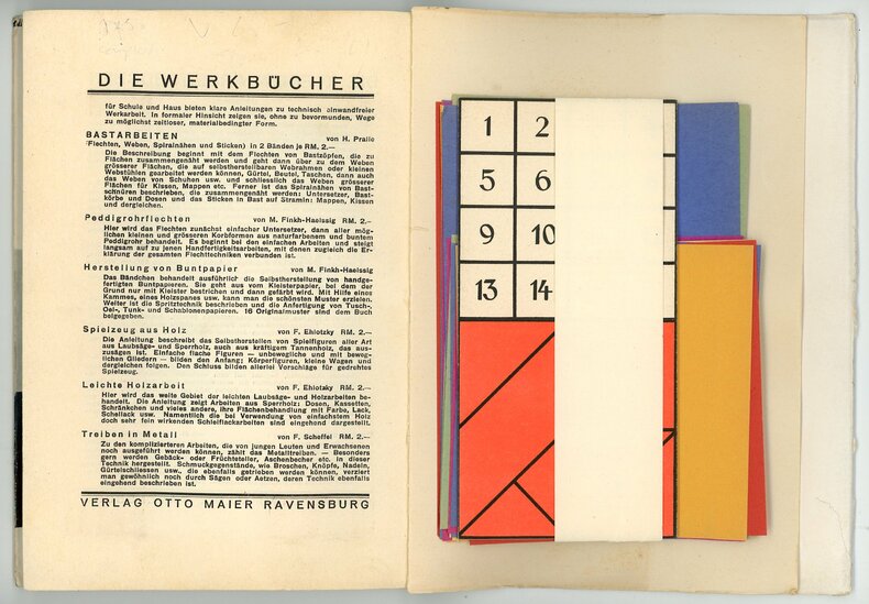 Verlag Otto Maier. Ravensburg. [1930]. Petit in-8 (20 x 14 cm). 96 pp, VIII planches de clichés noir et blanc, (8) pp. de catalogue de l’éditeur : couvertures de papier rempliées sur carton souple blanc, la première illustrée d’un photomontage en noir et blanc, fillette alitée avec poupées, pantin de papier et découpages sur un bandeau noir en pied, (12) ff. de papier de couleurs rectangulaires, (12) ff. de papier de couleurs carrés et une planche de carton avec chiffres et formes géométriques à découper insérés dans un bandeau de papier appliqué à l’intérieur de la seconde couverture.