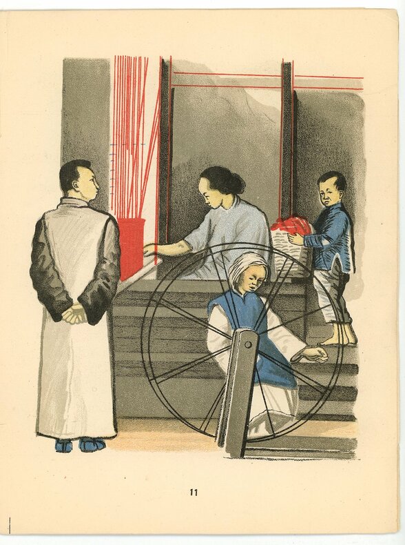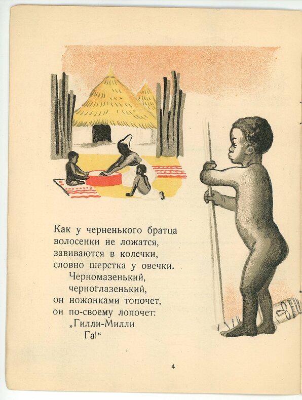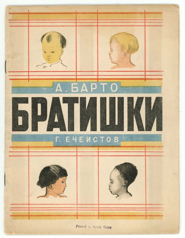 Agnia Barto (1906-1981), poétesse du régime aussi connue que Marchak. Ses vers sont illustrés par Georgi Etcheistov (1897-1946), peintre et décorateur de théâtre, dont les œuvres furent présentées aux expositions internationales de Paris en 1937 et de New York en 1939. Couvertures et 13 planches lithographiées en couleurs illustrent le récit de quatre enfants de couleurs et de races différentes. Parents au travail, touchants enfants à demi nus. Neuvième édition. Un petit angle de papier manquant en tête de la page 13, sans atteinte à l’illustration. Angle supérieur plié sur la seconde couverture avec un petit manque de 5 mm.