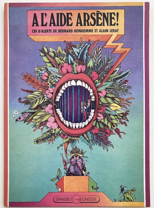 Cri d’alerte de Bernard Bonhomme et Alain Leray. Illustrations d’Alain Leray, scénario, mise en page et en couleurs de Bernard Bonhomme, commentaires d’un auteur anonyme. Concept éditorial François Ruy-Vidal. Grasset-Jeunesse. 1974. Grand in-4 (32,5 x 23,2 cm), (30) pp., contre-gardes comprises : reliure de papier toilé mat en tons dégradés de mauve et vert d’eau et de rose orangé, premier plat illustré d’une grande bouche entourée de feuillages.
