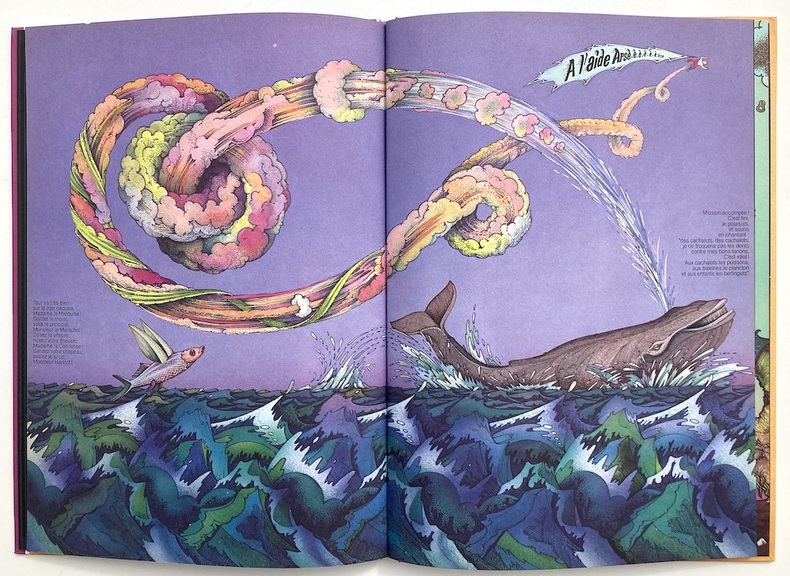 Unique édition. Comme indiqué en préface [de Bernard Bonhomme] : “Ce livre étant fait pour être vu plutôt que lu, si le texte vous ennuie, ne vous astreignez pas, contentez-vous des images et de tourner les pages.” Diplômé de l’école Olivier de Serres, le graphiste Alain Leray illustra également de nombreuses pochettes de disques et travailla dans différents domaines de création artistique. Histoire en images avec un tout petit texte qui invite l’enfant à interagir. Planches et doubles planches exubérantes et pages séparées en quatre illustrations également surprenantes, un plan-séquence de film plus qu’une bande dessinée. Alternance de pages en tons d’ocre et de gris et de pages aux vifs coloris. Dos légèrement insolé. Les Livres d’Harlin Quist et François Ruy-Vidal. Chez Les Libraires associés/Librairie Michèle Noret. Paris. 2013, 173.