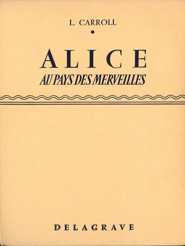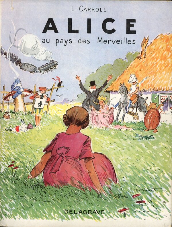 Traduction de Henriette Rouillard. Illustrations de A. Pécoud. Librairie Delagrave. Paris. 1957. (27,7 x 21,7 cm). 94, (1) pp. : cartonnage de l’éditeur de papier toilé abricot, titre estampé en noir, jaquette illustrée en couleurs, Alice, de dos, assise dans l’herbe devant les personnages du livre.