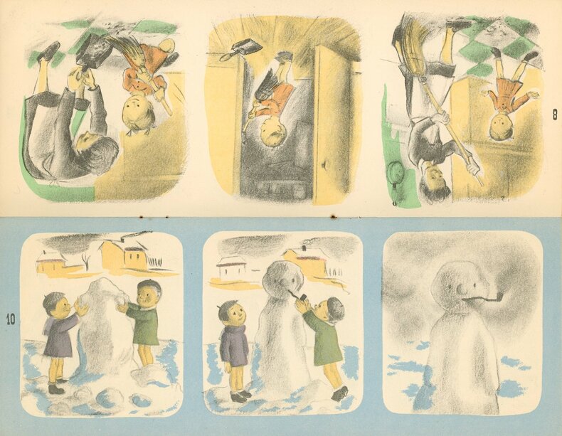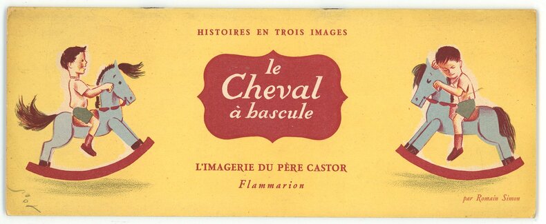 Premier tirage. Second album de la série par l’artiste Romain Simon (1916-2007). D’ascendance russe par sa mère, il suivit sa formation artistique auprès de Charles Picard le Doux, devint décorateur de théâtre et sera après guerre un collaborateur assidu du Père Castor. A chaque page une histoire en trois images lithographiées en couleurs est à lire en ouvrant l’ouvrage de bas en haut. Agrafes rouillées.