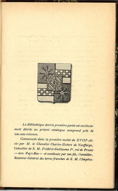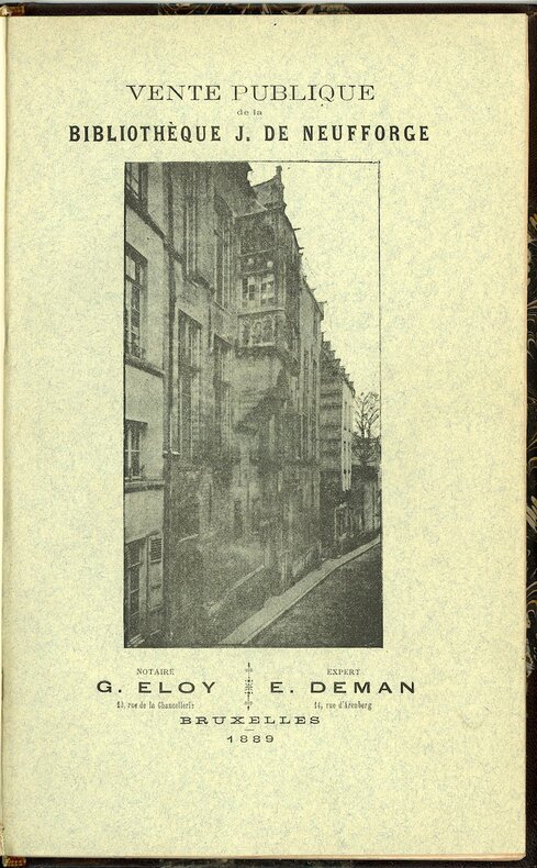 Notaire G. Eloy. Expert E. Deman. Bruxelles. 1889. [Sur la couverture]. Vente du 6 au 11 mai 1889. Catalogue d’une importante collection de Beaux Livres Anciens provenant de la bibliothèque de feu M. le Chevalier J. de Neufforge. Edmond Deman, Libraire-Expert. 14, rue d’Arenberg. Bruxelles. 1889. In-8 (25 x 16 cm). VII, 109 pp. : demi-maroquin brun à coin, couvertures conservées, cliché de l’Hôtel de Ravenstein à Bruxelles sur la première, marque illustrée du libraire-expert au centre de la seconde (Fernand Khnopff).